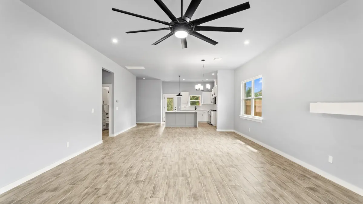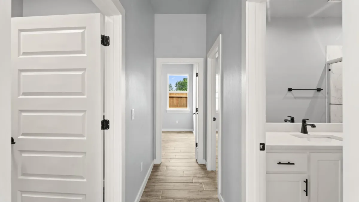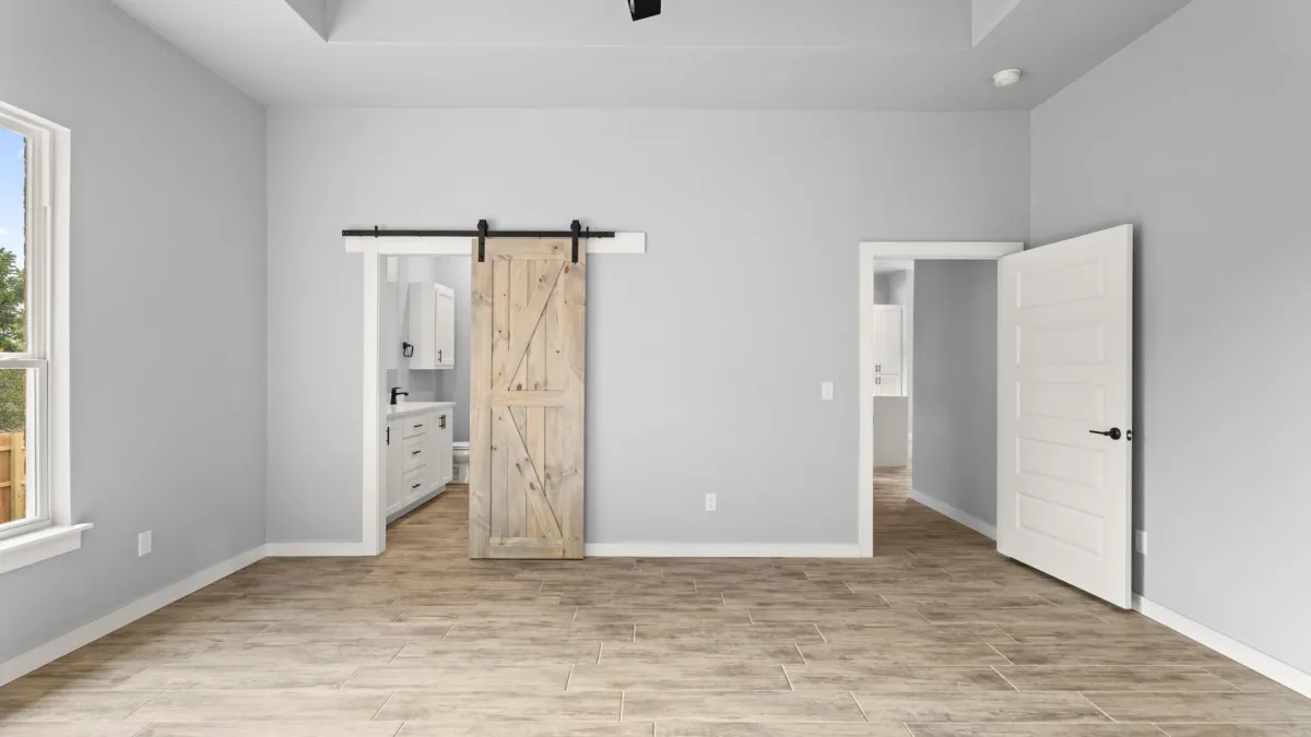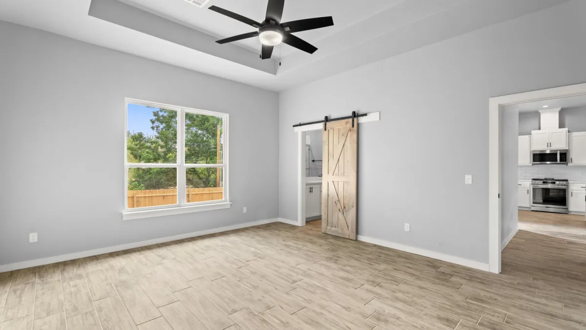 Retreat to the primary suite, complete with a spa-like bathroom, barn-door entry, and oversized walk-in closet. Energy-efficient windows, spray-foam insulation, loose-fill attic insulation, and a post-tension foundation ensure comfort, durability, and lower utility costs. The living area also includes a premium Big Fan ceiling fan, combining sleek style with performance.